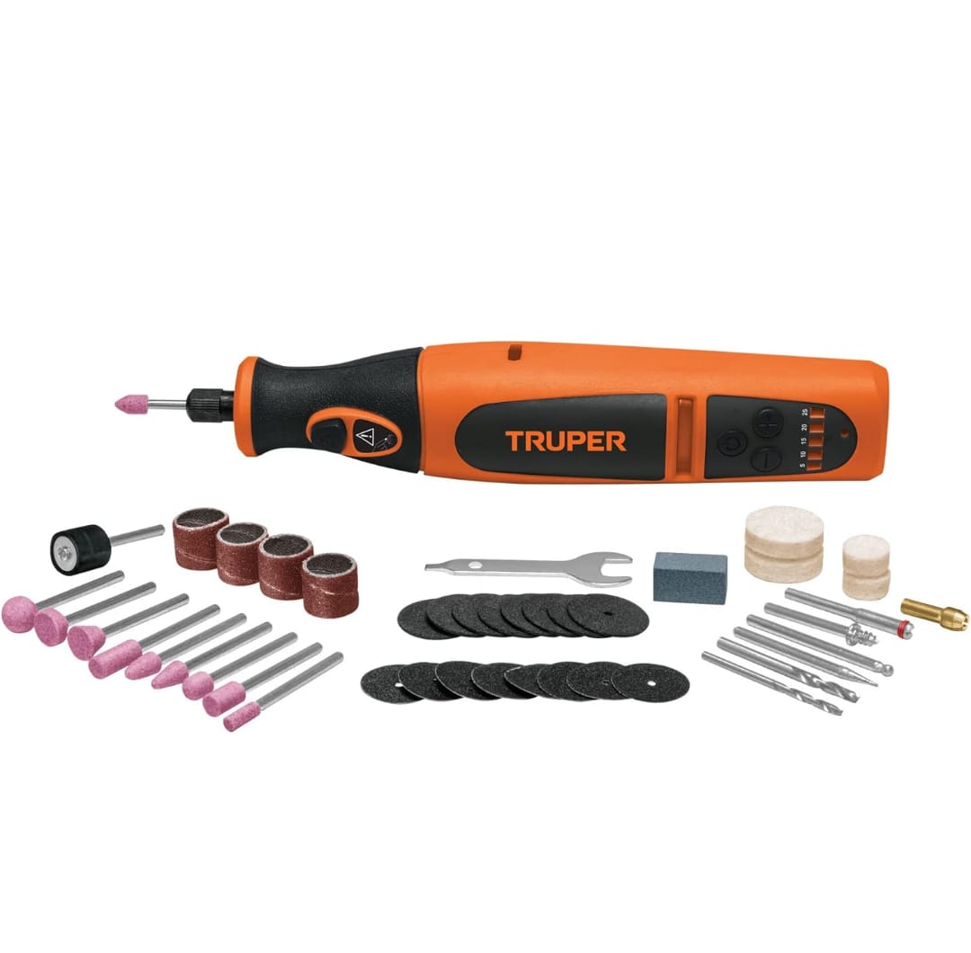 Herramienta rotativa inalámbrica 7.2V, profesional con 45 accesorios y estuche de tela.